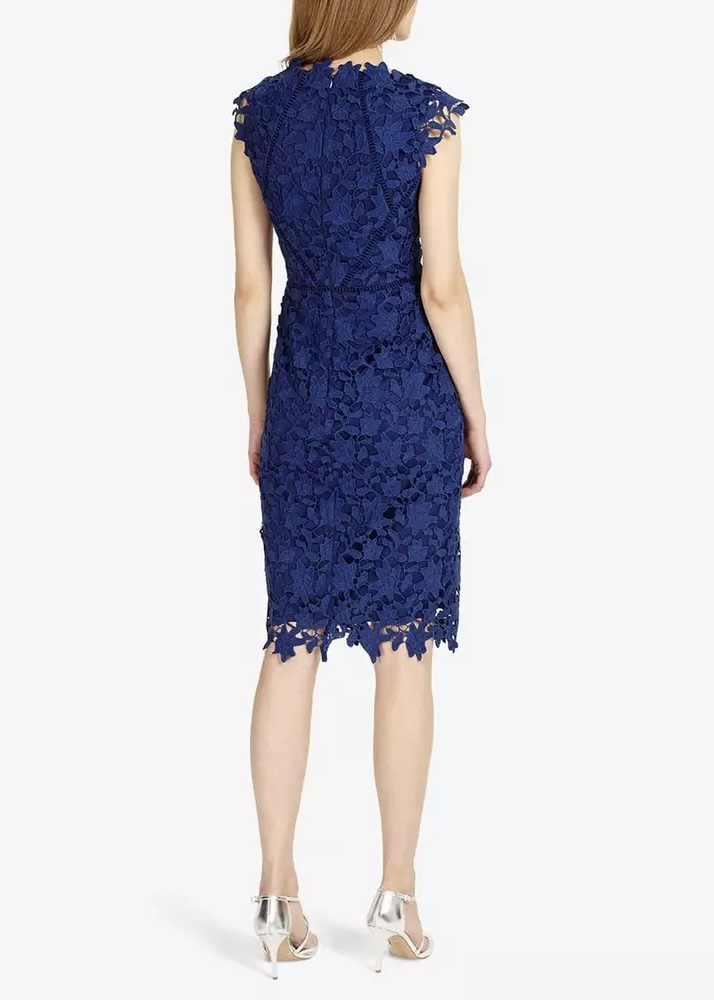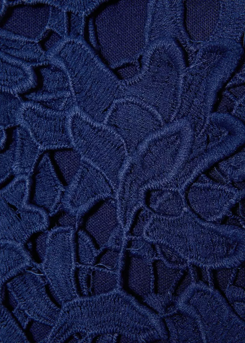 Model o dopasowanym fasonie subtelnie podkreśla sylwetkę, a długość do kolan nadaje stylizacji klasy i ponadczasowej elegancji. Całość wykonana jest z bogato zdobionej koronki o kwiatowym motywie, która tworzy wyjątkowo szlachetny efekt. Delikatnie wycięte wykończenie przy dekolcie i ramionach dodaje lekkości oraz romantycznego charakteru.