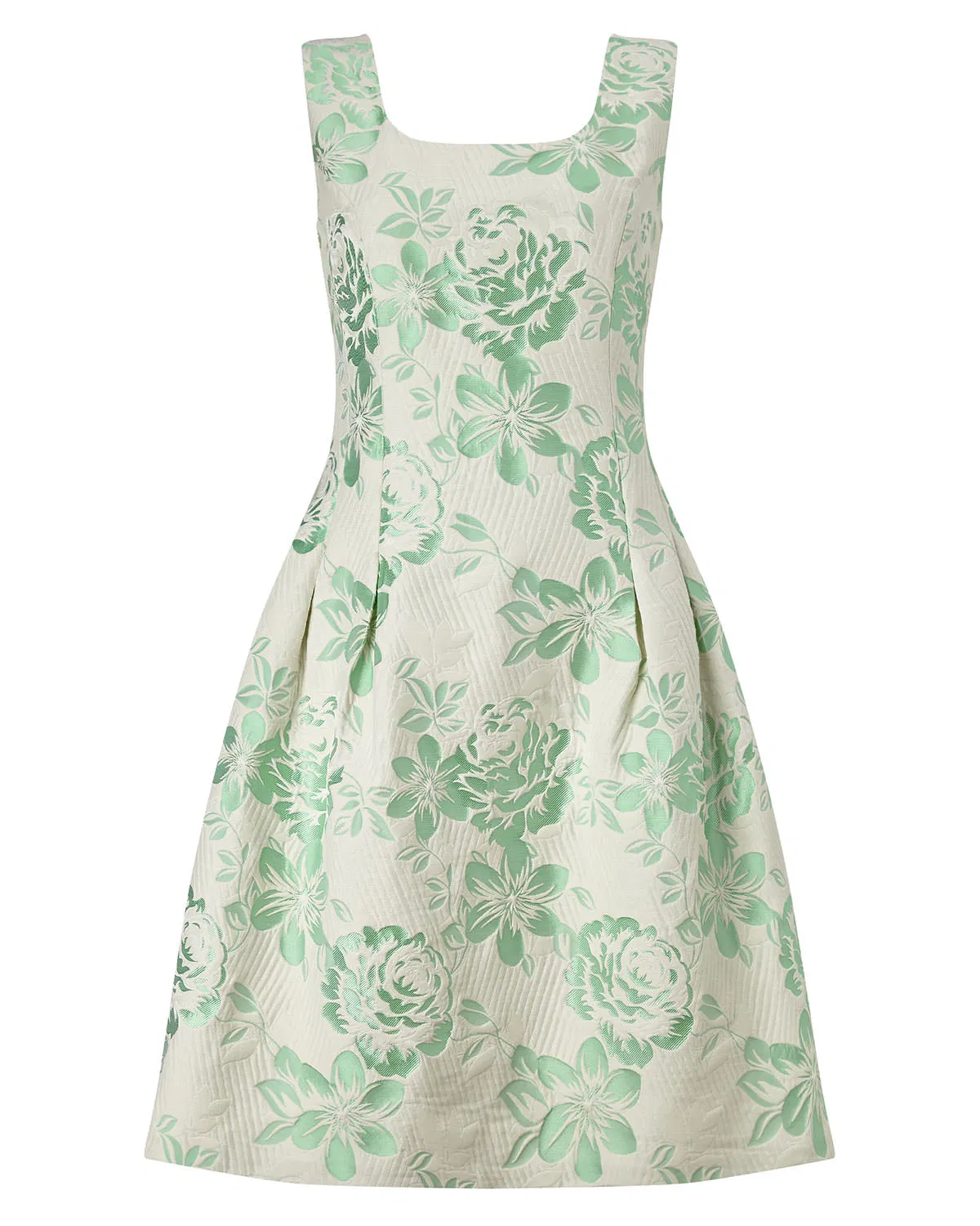 Elegancka sukienka w żakardowy wzór z motywem seledynowych kwiatów to propozycja idealna na wyjątkowe okazje. Posiada kwadratowy dekolt z przodu i z tyłu, który subtelnie podkreśla szyję i ramiona. Odcinana w talii, pięknie modeluje sylwetkę, a składane plisowania w spódnicy  nadają jej lekkości i eleganckiego ruchu.