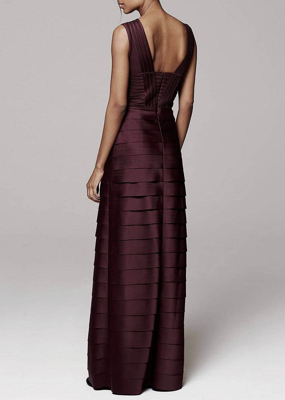 Zachwycająca suknia wieczorowa o ponadczasowym kroju kolumny, zaprojektowana z myślą o wyjątkowych okazjach. Model w modnym, jednolitym kolorze burgundu łączy klasyczną elegancję z nowoczesnym wykończeniem.
